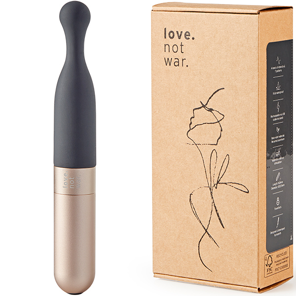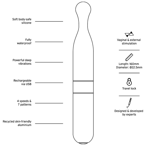 Love Not Warバレットシリーズは、美しいデザイン性とサステナブルであること、どちらも兼ね備えた素材「リサイクルアルミニウム」をベースに作られています。お肌に直接当たる先端部分は、ふんわりとソフトな心地よいシリコン。表面がベタつかず、なめらかですべすべしています。柔らかさを保ちつつもホコリは付きにくく、洗い流してお手入れすることが簡単です。撫でるように繊細な振動から、お腹の中心に向かって響きわたるパワフルな振動、さらに、リズミカルな脈動まで、全10種類のバラエティに富んだ振動パターンを選べます。ボタン一つでシンプルな操作。便利なのはトラベルロック機能。カバンの中で電源がオンになってしまう…まさかの事態を防げます。30分以内であれば1mまで浸水可能な完全防水仕様なので、万が一浴槽に落としてしまっても安心。バスルームでも楽しめて、使える幅も広がます。●素材:シリコン、リサイクルアルミニウム、リサイクルABS樹脂、バイオプラスチック●充電方法:USB●充電時間:フル充電2時間●連続使用可能時間:最大1時間●振動パターン:10(振動強弱4段階+リズムパターン6種)●防水:完全防水(IP67)●トラベルロック機能つき※こちらの商品は受注発注商品の為、ご注文から発送までに3、4営業日掛かる場合が御座います。