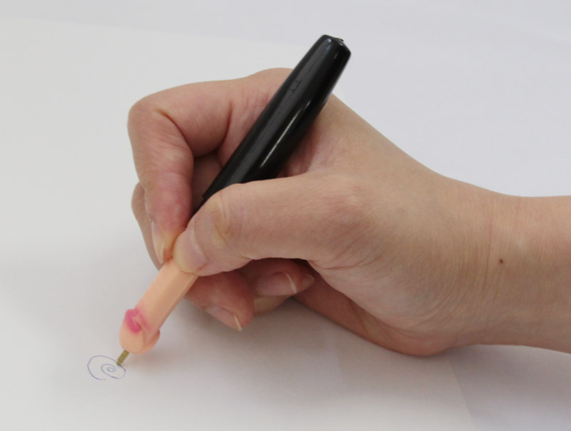 見た目はごく普通のボールペン。しっかり書ける実用性。但し、蓋を開けるときは周りにご注意を。