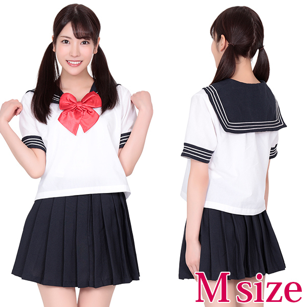 大きな赤色のリボンが、とてもよく目立つセーラー服。リボン付ブラウスとミニプリーツスカートのセットです。紺、白、赤の、制服定番カラーで、使いやすいコスチュームです!赤いリボンが私の目印!※L・LLサイズ(b09281)(b06309)あります。靴下は別売