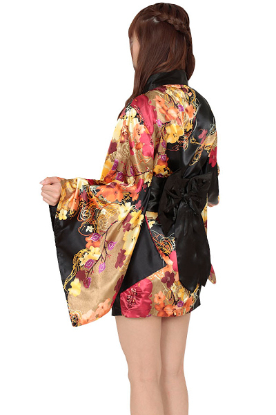 その姿はまるで夜の蝶…!艶やかな色彩が映えるセクシーなミニ着物コスチューム。黒地に鮮やかな花と蝶をあしらった、豪華絢爛な着物風ドレスが登場!後ろ姿を飾る黒帯は作り帯なので、本格的な着こなしが簡単に出来ちゃいます。