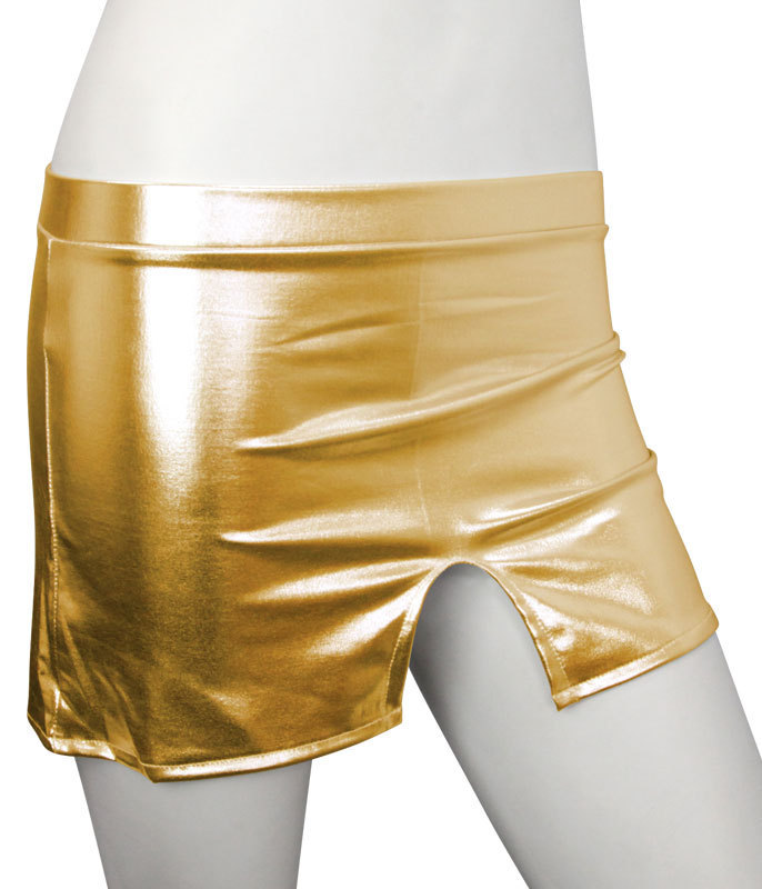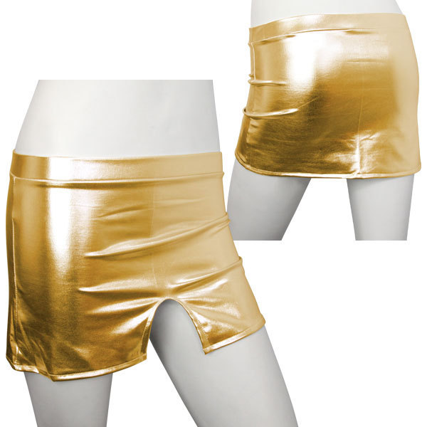 目立ちたい方必見!ステージ映えするギラギラミニスカート。●きらきら輝くメタリック風●ゴージャス気分なゴールド●セクシーに見せる超ミニ丈●片側のみカッティング入り●前後どちらでも着用可能。金属的な光沢感でインパクト抜群!ステージ衣装としてもおすすめの派手スカート。カッティングは前or後ろのどちらにしてもセクシーに決まります。