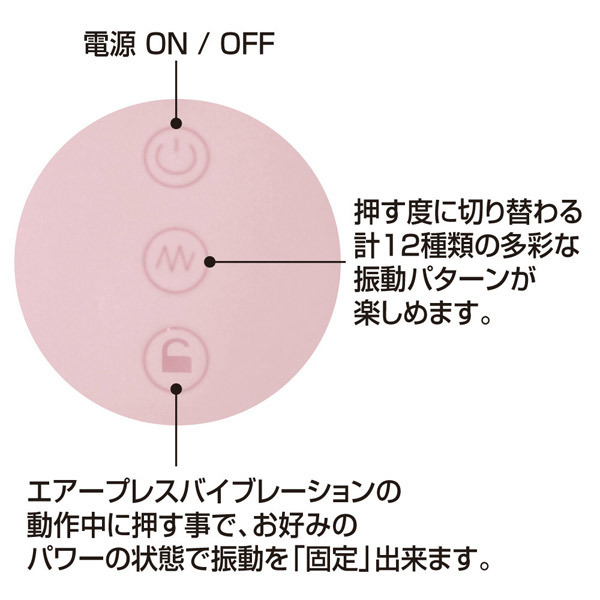 握る圧力でW振動をダイレクトにコントロール♪キュートなバルーンフォルムの新感覚バイブ。●滑らかな肌触りのシリコン製●丸みを帯びたバルーンボディ●全長18cm・挿入部最大径3.6cm●本体と子機に高性能モーター●本体を握る圧力で強弱調整可●振動パワーのロック機能搭載●12パターン振動はボタン切替●USB充電式(専用ケーブル付属)●充電60分で約90分連続使用可。バルーン状になった本体下部の両サイドを押した際の圧力によって、振動パワーを自由にコントロール出来る「エアープレスバイブレーション」機能を搭載!ダイレクトに振動を操ることで、より直感的に楽しめるバイブレーター。「エアープレスバイブレーション」の動作中にお好みの振動パワーのまま固定できるロックボタンを配置!また、バルーンによる振動の強弱以外にも、ボタンプッシュで切り替わる12種の振動パターンも搭載しています。