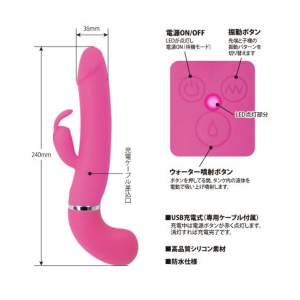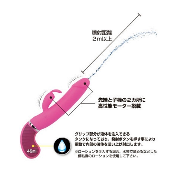 遂に登場!中出し体験ができる疑似射精機能を搭載した高性能バイブ「ウォーターガンバイブレーター」。●ピストルのようなシルエット●高品質なシリコン素材を採用●滑らかボディで挿入感も抜群●先端&子機に高性能モーター●12種類の多彩な振動パターン●ウォータースプレー機能搭載●液体45mlをタンクに注入可能●ボタンを押すと先端から噴射●液体の噴射距離は約2m以上●生活防水仕様で丸洗い可能●電源はUSB充電式。先端からお好みの液体をドピュッと発射!中出し体験が出来るウォータースプレー機能を搭載した「プリティラブ」シリーズのバイブレーター。雫マークの噴射ボタン押下中は、タンク内(グリップ部)にある液体を自動で吸い上げて噴射し続けます。※詰まり等の原因になりますのでローションをタンクに注入する場合は、水やぬるま湯で薄めた低粘度のローションをご使用ください。