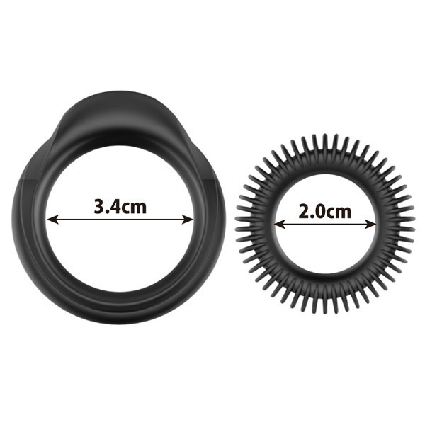 勃起増大、持久力UP、快感MAX!高品質シリコン製コックリング2種セット「ゴッドオブザリング 1」。細かなヒダがびっしり並んだ刺激的なフォルムの小リングは内径2.0cm、シンプル形状の大リングは内径3.4cm。大リングには持ち手のように摘めるベロがあるので位置調整がしやすくなっています。男性自身をしっかり締め付けて強力サポートするペニスリング2種セット!2個同時に装着すれば神の如きパワーがその竿に宿るかも。