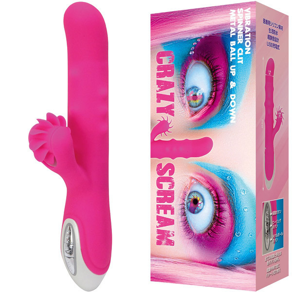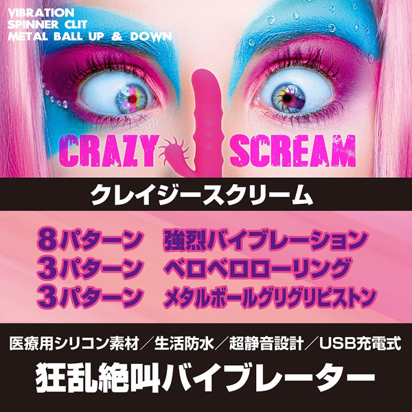 クリをペロペロ&Gをグリグリ!狂乱絶叫のハイスペックバイブレーター「CRAZY SCREAM」。クリトリスを上下からペロペロ愛撫するローリングブラシを搭載!さらに、内蔵されたムービングメタルボールが上下左右に激しく動き回りながら掻き乱し、快感ポイントを逃さず刺激します。強烈ヘッド振動は8パターン、子機ローリングは3パターン、メタルボールアクションは3パターンと、バラエティ豊かな刺激を備えたバイブレーター。医療グレードシリコン製、生活防水&超静音設計のUSB充電式(コード付属)。