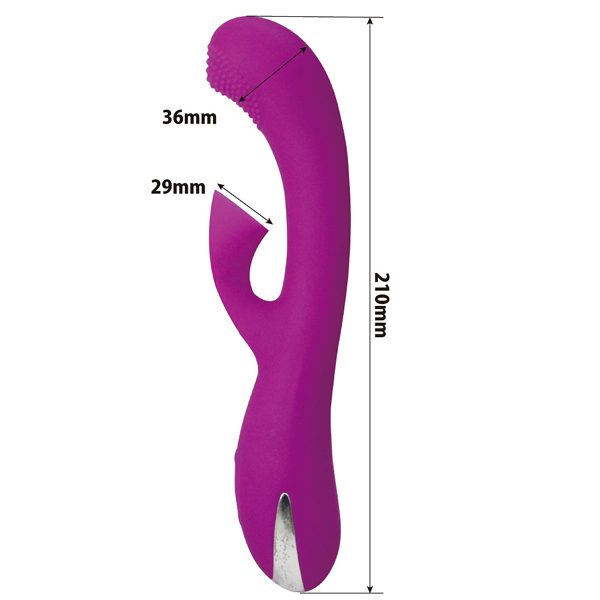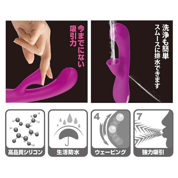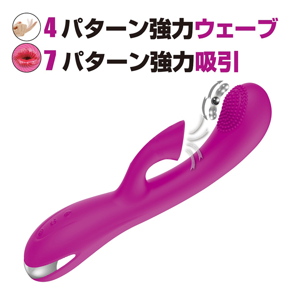 Gスポ&クリを2つの快感が襲う!異なる刺激で責め立てるバイブレーター♪大きさは21cmと平均よりは少し大きめのサイズで、挿入部は入れ応えのある3.6cm幅。少し出っ張った先には細かなイボが設置され、内部には4パターンの上下ウェーブ動作を搭載したボールが内蔵!指で掻き出すような気持ちよさを感じられます♪また、人の口で吸われるかのようなソフトな吸い口で、クリを強力吸引して刺激しながらGスポとクリの同時責め!その気持ちよさは、いつもの刺激に飽きた方に大変オススメです♪本体は高品質なシリコンを採用で、多少の水濡れにも対応できる生活防水も搭載。吸い口の洗浄も水で流すだけと簡単で、スムーズに排水もしてくれるから安心ですね♪電池不要なUSB充電式で180分充電すれば、およそ70分の連続稼動が可能!使用時にはワイヤレスでお使いいただけるので、自宅のどんな場所でも楽しめちゃいます♪