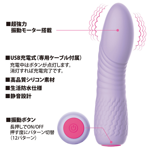 全長11.8cmのコンパクトなボディに高性能と高品質を詰め込みました♪12種の強力振動でピンポイント刺激が楽しめる淡いパープルカラーの一本式シリコンバイブレーター。触り心地の良いマットな質感の高品質シリコンを使用!乳首やクリに押し当てたり、挿入してGスポを刺激したりなど、どちらの責めにも適したボディなのでお好みの責め方でお使いいただけます。ご自宅で楽しむのはもちろん、バッグや車内に忍ばせコッソリ楽しむのもアリですよ♪USB充電式(専用コード付)、生活防水仕様となっております。