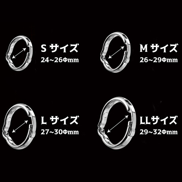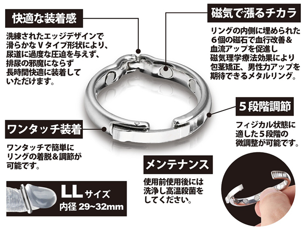 6つの磁石による磁気のパワーで男性の自信を取り戻す!金属製のスタイリッシュなデザインが魅力的なペニス増強グッズの男性補助リング。包茎や持久力でお悩みの男性にうってつけ!内径2.9〜3.2cmのリングが包皮を亀頭部分でまとめつつ、リング内側の磁石で血流を促すことで力強く逞しい男根へと導きます♪身体の状態に適した5段階のサイズ調整や装着もワンタッチで楽々!使用後は煮沸消毒で殺菌することで、常に清潔な状態でお使いいただけます。