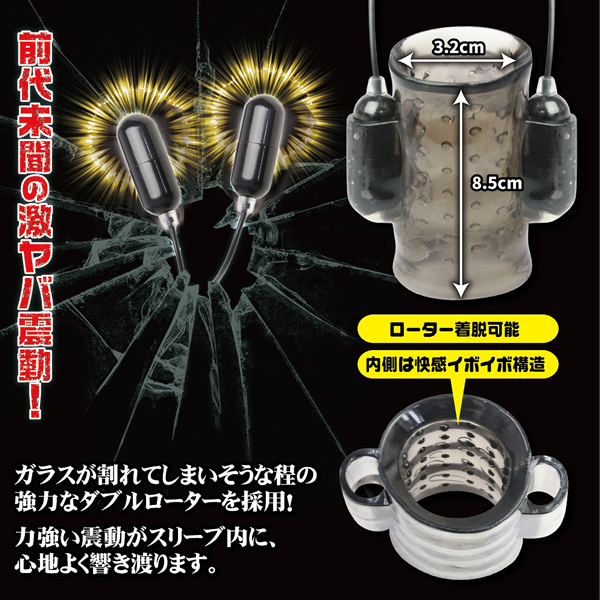 超激震ローターとイボイボ構造のペニススリーブで快感責め!ダブルローター付きの電動ペニスサック。伸縮性に優れたエラストマー素材使用で装着感バツグン♪亀頭やサオなど好きな位置に被せれば、Wローターの激しい振動で絶頂まで追い立てる!ローションで滑りをよくしてから扱けば、また違った快感もお楽しみいただけます。強弱はダイヤル調整式