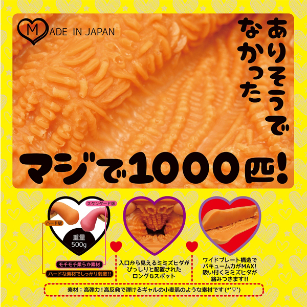 千匹のミミズのヒダが絡み付き刺激するモチっと張りのある高弾力素材の非貫通オナホ(日本製)。小麦色に焼けた黒ギャルをイメージした弾力のある約500gの肉厚ボディが、ぐにゅぐにゅと絡み吸い付き責め立てる!ミミズ1000匹の比喩ではないリアルな快感をぜひお試しあれ♪ローション付属