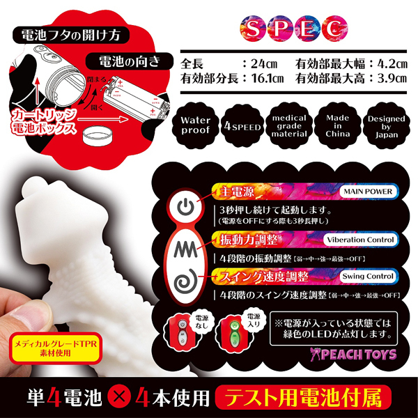 極上の柔らか質感!イボ形状とふわプニュ素材が未知なる快感をもたらす電池式バイブ。柔らかく弾力のある初心者に優しい医療用シリコン素材を採用!ボディにイボ突起、挿入部分を約16cmと長くしたことで、奥イキ好きが「ヤバい」と唸るほどのクオリティに仕上げました♪先端部分には強力ローターを内蔵しているので、身体の芯まで響く振動をご堪能いただけます。単4電池×4本使用
