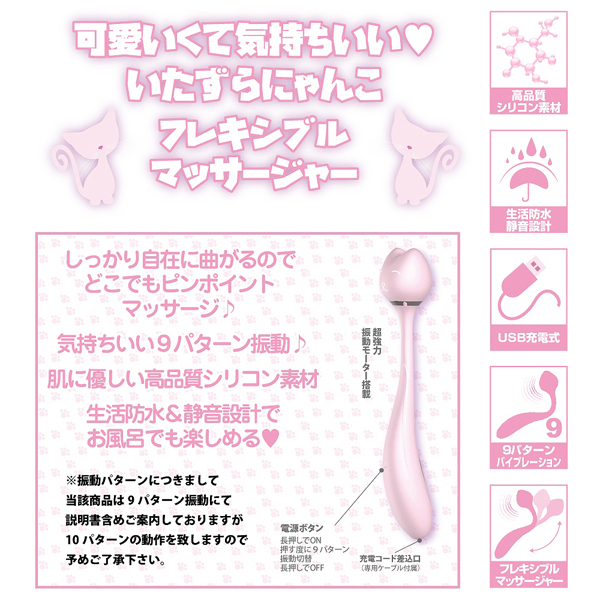 自由に曲がるフレキシブルボディで欲しい所をピンポイントに刺激♪猫型ヘッドの可愛いUSB充電式ローター(ピンク)。肌に優しい高品質シリコン素材を採用!生活防水&静音設計なので響きやすいお風呂場でも楽しく使える♪10種類の振動パターンを搭載した強力モーター内蔵の可愛いローターです。自分へのご褒美、パートナーへのプレゼントに♪
