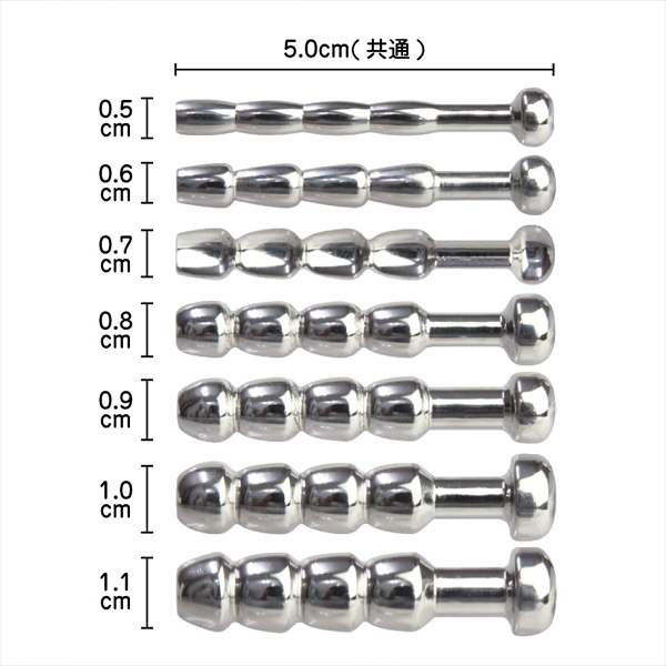 細めから太めまで幅広く試せるお得な7本入り!硬質なメタル素材のビーズタイプブジーのセット。煮沸消毒の出来る金属製で衛生的!自分に合ったサイズでお楽しみ下さい♪内部は中空構造となっています。