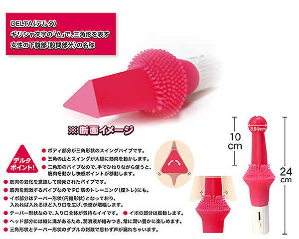 角ばった三角形状が与える至極の快感!世界初の新発想「デルタバイブ」(電池式)。イボヒダを超える刺激!うねうねと動くスイング機能搭載で、刺激を変えたい時には少しバイブを捻るだけで声が漏れるほどの快感が襲う♪先端部分に縦溝を施したことでローションが絡み常時潤い長続き!