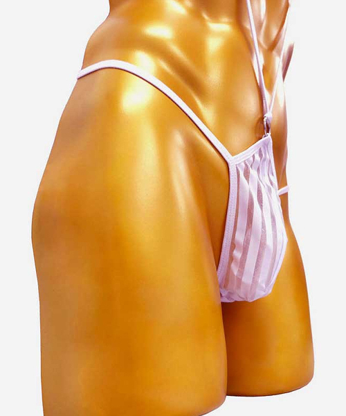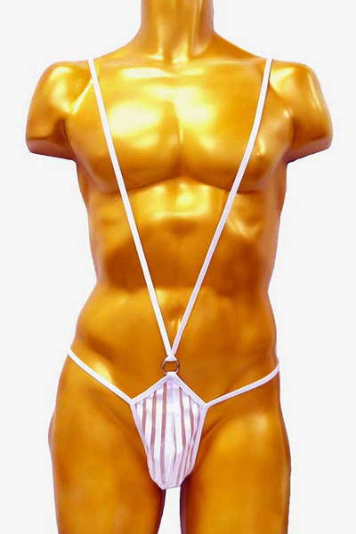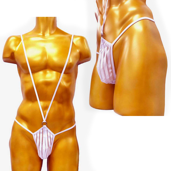 V字ラインでシンボルを強調するサスペンダー付のメンズ用サック。縦縞模様を描くように白地とシアー素材を組み合わせた一枚!着衣の下に身に着けることで、日常的に吊り下げられるような浮遊感をお楽しみいただけます。ホワイトカラー、フリーサイズ