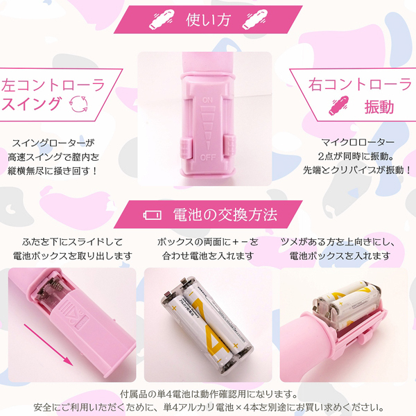 【単四電池×4本(付属)】ポルチオ&クリイキのダブル悶絶レッスン!3つのモーターと6Vパワーで、秒ヌレ即イキ!ぷっくり亀頭が膣内をスクリュー回転!快感目指して突き進む!日本女性にフィットするこの形状が、高速スイングで膣内を縦横無尽にかき回します。クリバイブは、ポイントを押さえたつぶつぶと3本の触覚でクリ歓喜!柔らかい亀頭ヘッドがグリングリン膣中を掻き乱してくれるパワフルなスイング回転と、クリを3本の触覚やツブツブで的確に振動刺激するクリバイブでイカせてくれるバイブです!