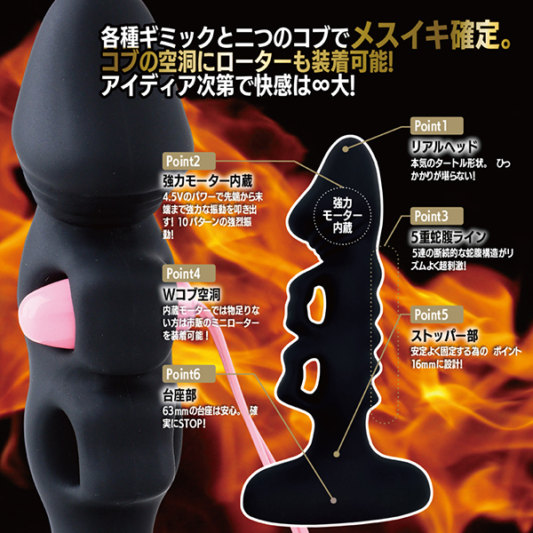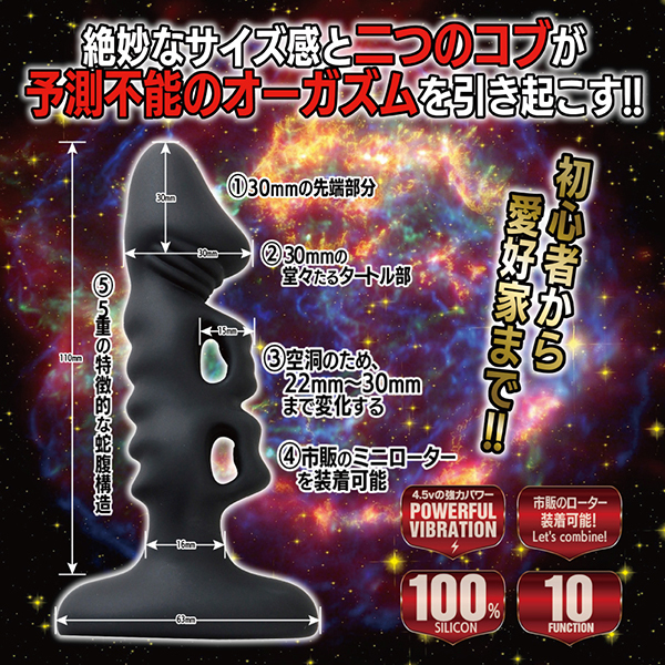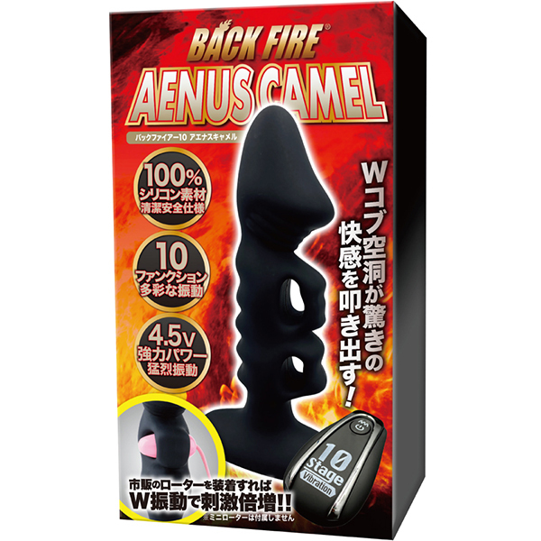 刺激的なデコボコが効いたフォルムと単四電池3本使用のハイパワーが自慢の「バックファイアー アエナスキャメル」です。4.5Vの強力パワーと10ファンクションシステムを搭載♪100%シリコンの電動アナルプラグで、強力な振動と独特な形状が嫌というほど攻めまくる!アエナスキャメルは二重のコブが圧迫・刺激・強烈な振動を叩き出す♪絶妙な2つのコブが予測不能のオーガズムを存分にご堪能あれ。
