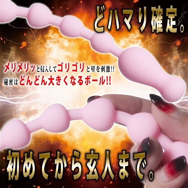 100%ピュアシリコンで作成した安心安全な10個のビーズが連なった取っ手付きのアナルビーズです。先端部は直径2cmと2.6cmの一体ビーズ型。続いて直径2.2cmの玉が3連続して、直径1.6cmのビーズが5連続きます。差した状態で、ローターをあてたり、そのまま散歩したりと想像以上にいろいろシチュエーションでの使用が可能です。