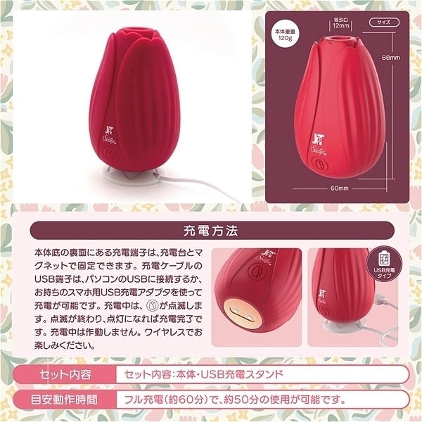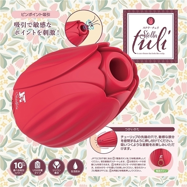 お部屋に咲いたチューリップ。しっかり気持ちいいアダルトグッズです。女性向け性感プレジャーアイテムの「Stella(ステラ)」から、チューリップみたいな吸引バイブがデビューしました。小さなインテリアのようにお部屋になじむ可愛らしさです。12mmの大口径で深さもたっぷりな吸引穴は、かわいい見た目からは意外に思えるほど、深く重い吸引振動を生み出します。大型モーターが生み出す力強い吸引をお楽しみください