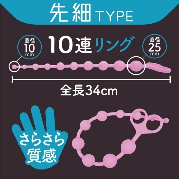 先端部10mmから25mmの9個のシリコンビーズが連続に襲ってくる初心者用。まずはここからメス化TRY!取っ手部のサイズは55mm全長340mmと全てシリコン素材の為、柔らかく丸洗いも出来て清潔に保っていただけます。