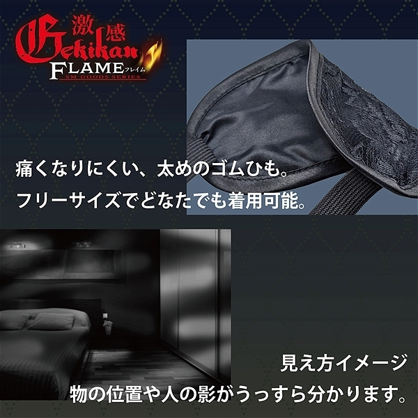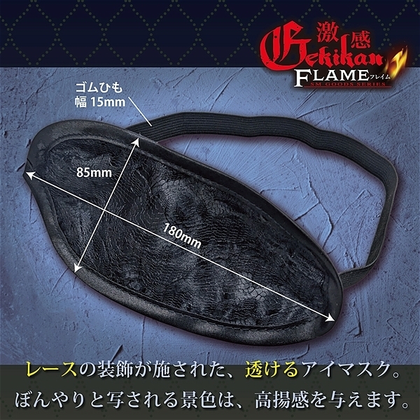 激感フレイムシリーズより、レースの装飾が施された妖艶感漂う透けるアイマスクです。ぼんやりと写される景色は、高揚感を与えます。また、物の位置や人の影がうっすら分かるため、SM初心者の方への安心感にも繋がります。ソフトSMプレイにもおすすめです。痛くなりにくい、太めのゴムひも。フリーサイズでどなたでも着用可能です。
