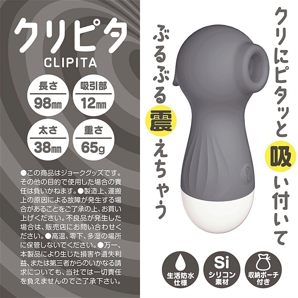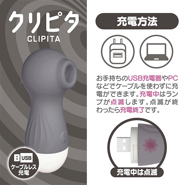現在各所で大ヒット中のクリピタに新色登場!!煩わしいコード要らずの直充電、12mmの吸引部、10アクションの振動、素材はシリコンで収納ポーチまで付属した全5色になったクリピタをお試し下さい。●カラー:グレー