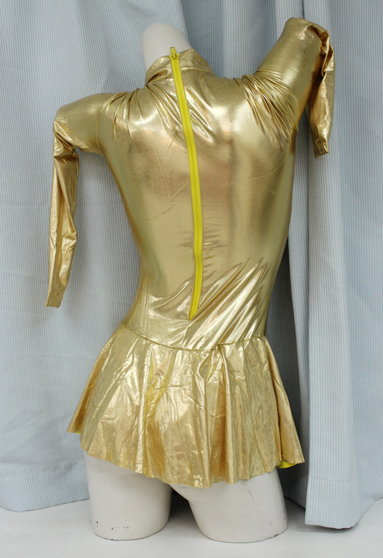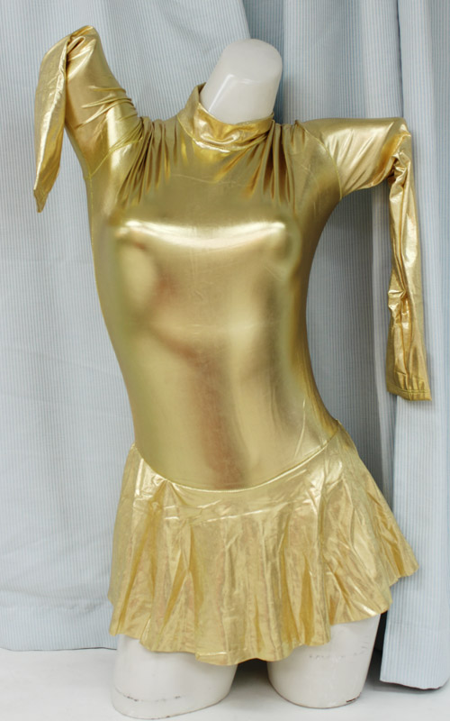 まるでフィギュアスケーターのような、スカート付きの長袖レオタード。エナメル製のように光沢のある、キラリと輝くゴージャスなゴールドカラー!伸縮性があるので、ピッチリとしたバストやクビレが美しいボディラインを引き立てます!ひらりと軽いスカートから覗く、ハイレグとヒップラインがとってもセクシーなコスチューム!背中のファスナーで脱着衣が可能です。※水洗い可、塩素系漂白剤による漂白不可、ドライクリーニング可、色落ちの可能性があります。※こちらの商品は在庫の状況によりお届けまでに4日〜7日程度かかる場合がございます。