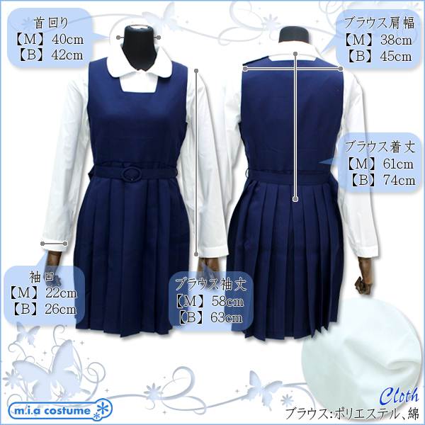 セット内容:ジャケット(襟取り外し可・肩パッド入り)、丸襟ブラウス(前開き・ボタン留め)、ジャンパースカート(バストからウエスト部分に肩ボタンとサイドボタンで着脱可・ベルト取り外し可)、ベルト※レトロな雰囲気漂うボレロが可愛らしい制服コスプレ(BIG)。中に着たジャンパースカートは、ハイウエストのノースリーブ仕様!お洒落のボレロの襟とリボンがポイントに!リブハイソックスや黒タイツと合わせて着こなしたい、お嬢様学校風の制服コスチュームです。※水洗い不可、塩素系漂白剤による漂白不可、アイロンは中温で当て布使用、ドライクリーニング可、色落ちの可能性があります。※こちらの商品は在庫の状況によりお届けまでに4日〜7日程度かかる場合がございます。