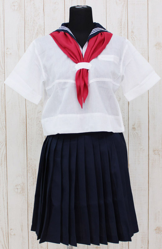 昭和っぽいデザインがキュート!私立学院のお嬢様風制服コスチューム。●切り替えが珍しい白の半袖トップス●首元が詰った紺色セーラー襟で真面目感アップ●襟元よりかなり下方にスカーフ留めを配置●一部ゴム入り・ウエストにフィットする膝丈紺色プリーツスカート。小さな襟と幅広に見える三角スカーフのギャップが可愛い制服コスプレセットです。※水洗い不可、塩素系漂白剤による漂白不可、アイロンは中温で当て布使用、ドライクリーニング可、色落ちの可能性があります、ご注意ください。※こちらの商品は在庫の状況によりお届けまでに4日〜7日程度かかる場合がございます。