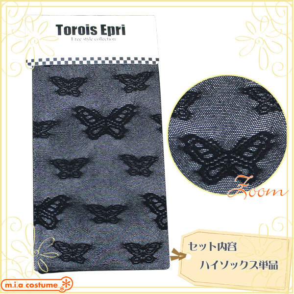 【在庫限り!大特価】嬉しいプチプラ価格♪透け感が涼しげなTrois Epri(トロアエプリ)の蝶柄ハイソックス。●セクシーなバタフライ柄ソックス●透け感のあるシースルーブラック●フリーサイズ。脚元をセクシーに飾るひざ下丈の蝶柄ハイソックス。コスプレ衣装はもちろん普段使いにもOKです。※ぬるま湯(30度)で優しく手洗いしてください、塩素系漂白剤による漂白不可、色落ちの可能性がありますのでご注意ください。