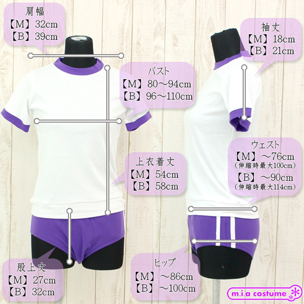 仕様:BIGサイズ B96〜110cm・W〜90cm(伸縮時最大114cm)・H〜100cm 上衣:着丈58cm・肩幅39cm・袖丈21cm ブルマ:股上丈32cm セット内容:上衣、ブルマ 素材:ポリエステル65%、コットン35%