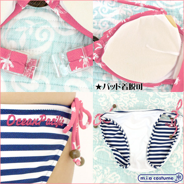 スポーティだけど可愛い!日本製のマリン風ビキニ水着2点セット(赤)。ヤシの木柄をプリントした南国感のあるブラに、青×白の横ボーダー柄ショーツを組み合わせた可愛い一着!ブラはパッド付きで着脱可能※手洗い可(水温30度)、塩素系漂白剤、アイロン、ドライクリーニング不可、色落ちの可能性があります。※こちらの商品は在庫の状況によりお届けまでに4日〜7日程度かかる場合がございます。