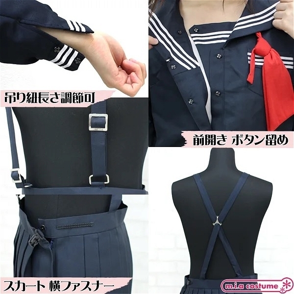 仕様:Mサイズ:B78〜92cm・W58〜73cm・肩幅39cm・袖丈54cm・着丈(上衣49cm、スカート50cm)・吊り紐の長さ(片側)〜87cm セット内容:上衣(前開きボタン留め)、吊りスカート(横ファスナー、アジャスター調整可)、タイ 素材:ポリエステル100%