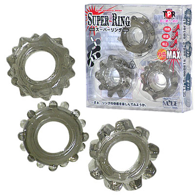 セックスプレイをより刺激的にエンジョイ!男性補助ペニスリング「スーパーリング」3個セット。内径1.8cm/厚み2cmの3種類のリングを全部付けるも良し、気分で使い分けるも良しと貴方のお好みで装着調整。超軟質素材を使用で驚きの伸縮率を実現!スモークタイプは逞しさを強調した存在感と、突起で刺激を高めます。