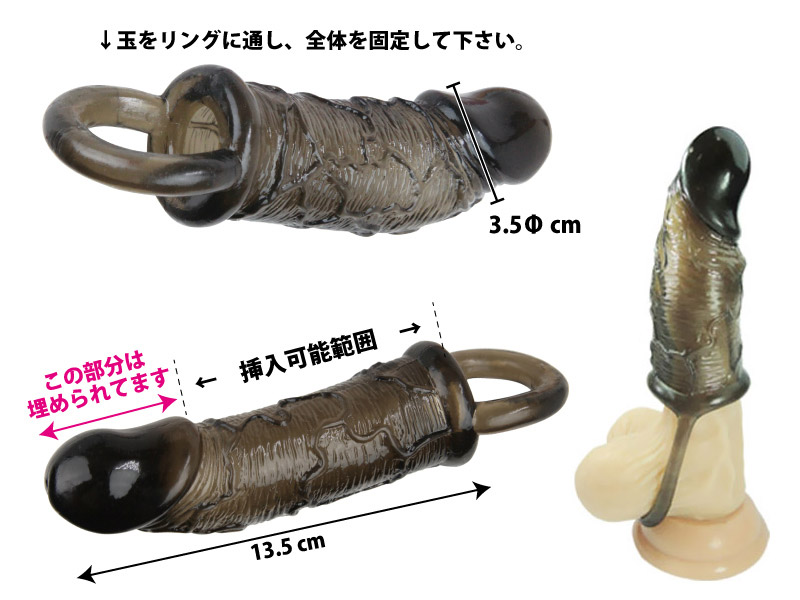 サイズアップ&締めつけで持続効果抜群!大人気「ボス」シリーズの玉掛けリング付きペニスサック(L)。漢を上げるスモークブラックカラーの本体は、べたつきやニオイのない、伸縮性に優れた高純度エラストマー素材を使用!浮き出た血管やカリに至るまで、リアルな造型に仕上げられています。亀頭部分は素材が詰まっていますので、その分だけ長さもアップ!ペニスサックを広げて根元まで被せ、ズレ防止に役立つ玉掛けリングを引っ掛けるだけで準備完了!サイズアップに加え、持続性と快感の向上を狙った機能的なペニスサックです。