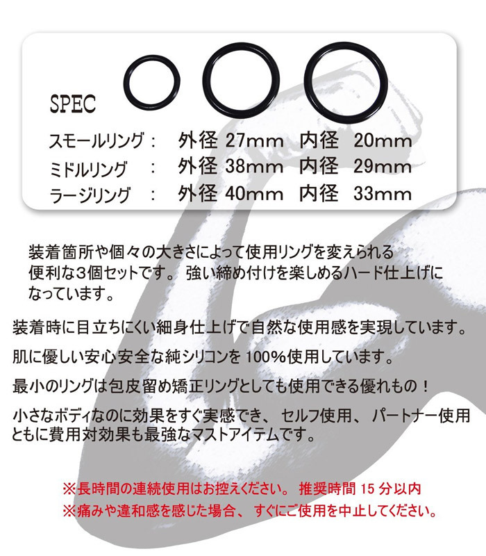 使い方自由自在!ギュギュッと男力をアゲるハードなコックリングセット。●締め付け強めのハードタイプ●安全なピュアシリコン100%製●細身リングで自然な見た目に●大きさの異なる3サイズセット●根元・先端…3本全装備も可能●スモールは包皮固定用にも◎。ひとりの時でもカップルでの使用にも役立つコックリング。1本だけ・2本まとめて・3本全部など、付け方もあなた次第!ただし無理な使用や長時間装着は痛みの原因となりますので、15分程度を目安に外すよう心がけてください。※痛みや違和感を感じた場合、すぐにご使用を中止してください。