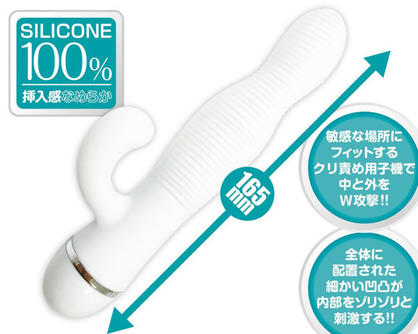 シンプルが一番!気持ち良さと快適な使い心地を追求した二か所責めバイブレーター。●清潔感溢れる全身真っ白ボディ●シルキータッチの純シリコン製●緩やかな波型×微細な凹凸入り●くびれ部分は自在に曲げられる●Gスポットを的確にヒット可能●クリトリスを直撃のカーブ子機●7種類の振動パターンを装備。官能的なカーヴィーボディにびっしりつけられた横ミゾがたまらない!膣壁を擦りながら奥へと進むエロティックバイブレーター。角度が自在=無理な体勢をとる必要がないので、ゴールまでストレスなく到達できます。
