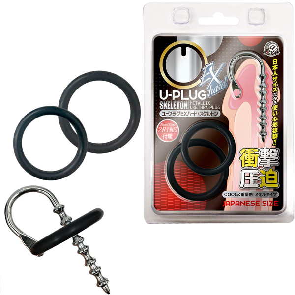 高刺激&圧迫感!!尿道アイテム『U-プラグ』に上級者向けのEXシリーズが新登場!COOL&重量感のあるメタルタイプはそのままに前作よりもハードな見た目と高次元の刺激がアナタの探求心と尿道を満たします。普通では満足できない尿道エキスパートへ!付属のリングを装着してプラグ位置を調整可能。リングサイズはご自身に合わせてお選びください。<スケルトン>骨のような凹凸形状が尿道全体を圧迫しながら奥へ進むたびにグリグリと刺激する!※無理のない範囲でご使用ください。商品特性をご理解のうえ自己責任でお楽しみください。