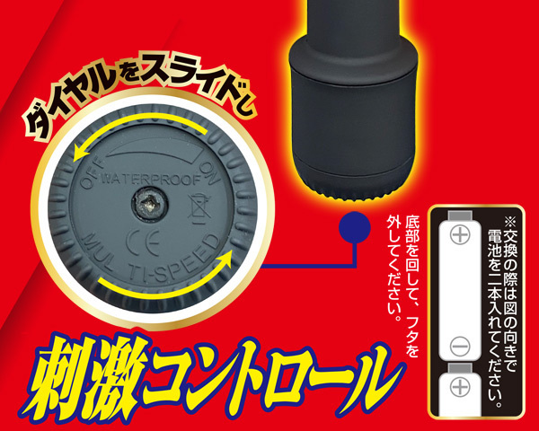 くの字に曲がった幅3.5cmの丸い先端形状でGスポを的確に捉え徹底的に刺激、中を圧迫しながら強烈振動を加えれば大量潮吹きまで一直線!ダイヤルを回すだけの無段階調整式で初心者でも簡単♪挿入部18cm、滑らかマット加工を施した電池式バイブ。丸洗い可能な生活防水仕様◎単三電池を2本使用、ブラック