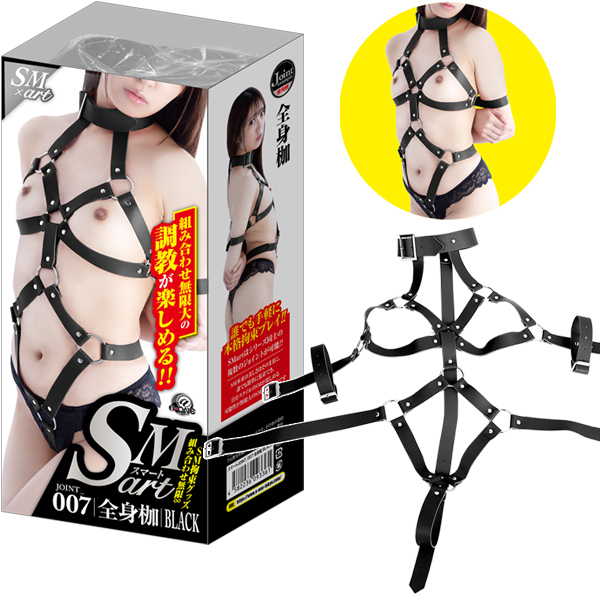 バリエーションは無限!ジョイント式SM拘束シリーズ「スマート」の全身枷。シリーズ全パーツ同士の接合が出来る斬新なSMグッズ!独自の調教スタイルで様々なSMプレイをご堪能頂けます。素材は合皮、肌に当たる内側はソフトベロア調素材を採用!調節ベルト穴の数を通常より多く設置した事により、女性から男性まで拘束が可能になりました。※画像はショーツを着用しています。