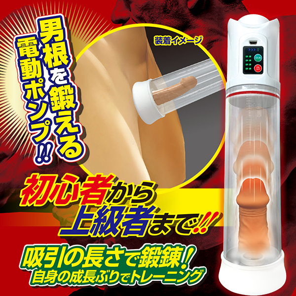 男根を鍛える電動ポンプ!!吸引は選べる4パターン!!初心者から上級者まで自身の成長ぶりに合わせて無理なくトレーニングができます。自身に自信が持てるよう、毎日コツコツ吸引しよう!シリンダーには、わかりやすいセンチ表記のメモリ付き。サイズアップを実感できてモチベ―ションもアップ。シリコンキャップは自身のサイズによって選べる2サイズ。根元に優しくフィット。シリンダーから外して洗えるので清潔に保管できます。コントローラーは簡単操作のワンプッシュ。吸引の長さを調整できます。充電は差し込むだけのUSB充電式充電時間:約120分/連続使用時間:約90分。※個人差がございます。長時間・過度のご使用はお控えください。体に合わない場合にはご使用を中止してください。
