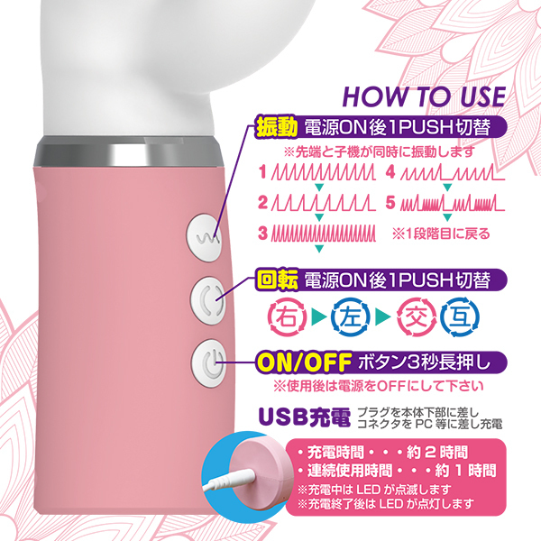 仕様:パッケージ:25.5×9.3×4.7cm 本体:全長22.5cm・挿入部11.0×3.8cm 材質:ABS、TPE 重量:270g USB充電式
