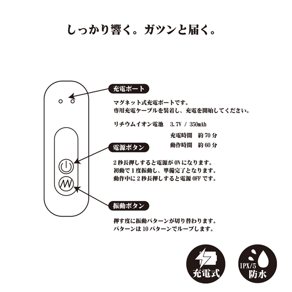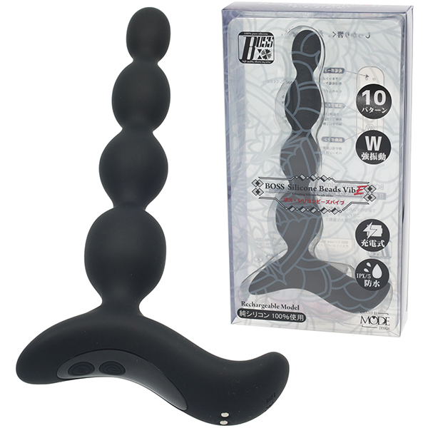 BOSSシリーズから充電式のビーズバイブが新登場です。しっかり奥まで届く強振動モーターが先端下部と最下部に搭載されているので、より欲しい快感部位に届くように設計されています。IPX5準拠の防水性能をもっており、丸洗いもOKな作りです。全体がしなやかな柔軟性を持っているので、体勢の変化やアナル、そして女性にも効果的にご使用いただけます。充電式なので面倒な電池交換も無く、ランニングコストも安心です。強力な快感開発バイブとしてお楽しみください。