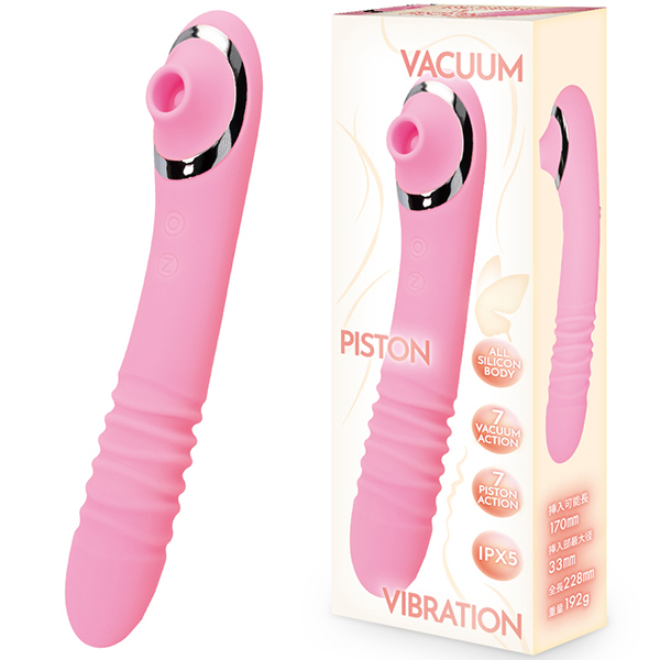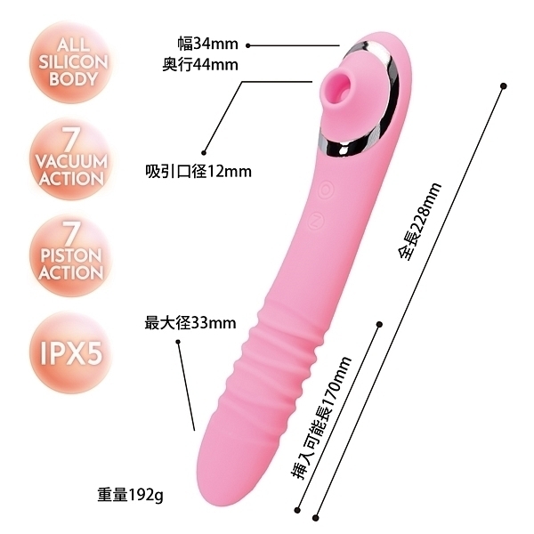 ロング挿入が可能なストレートタイプのピストンバイブの反対側に吸引ローターが搭載された二役アイテム登場です。肌触り滑らかな高品質のオールシリコンボディの挿入可能長は圧倒の170mm越え。さらに16mmのピストン機能と振動で奥までしっかり刺激を楽しめます。反対側に付いた吸引ローターも絶妙な吸引快感を楽しめる7つのパターン搭載。IPX5の防水等級だからしっかり洗えるので衛生的です。またパーツの密度を高めてプレイの邪魔になるアクションノイズを軽減しております。90分の充電で最大45分使用可能な強力なリチウムイオンバッテリー搭載です(使用環境により大幅に増減します)。●カラー:ピンク