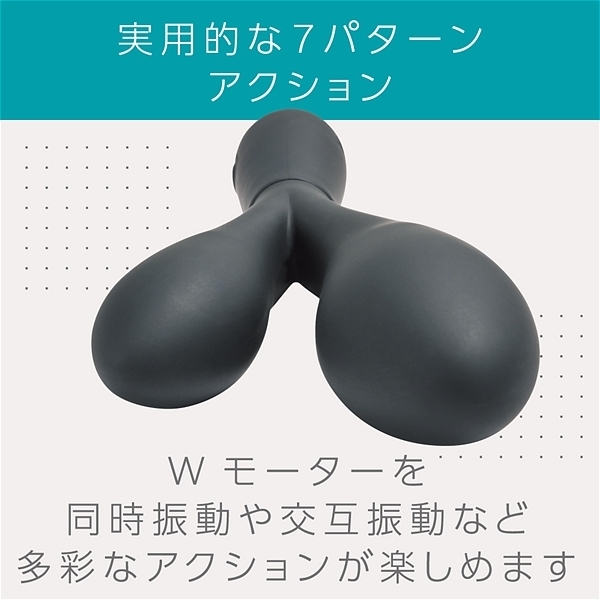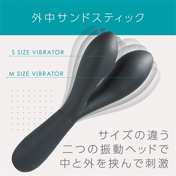 大小、サイズの異なる二つの挿入部が配置されたスティックバイブです。高品質なシリコン素材に上質な振動を演出する高性能モーターをそれぞれに搭載して、挟んだり、自分に合ったサイズを挿入してお楽しみ頂けます。IPX5の防水性能だからしっかり洗えて衛生的に何度も使用可能です。3.7Vリチウムイオンバッテリー搭載で90分で満充電、最大45分の連続使用が可能です(使用環境により大幅に増減します)。多彩で実用的な7パターン振動アクション。色んな楽しみ方が出来る高性能プレジャーグッズです。●カラー:ブラック