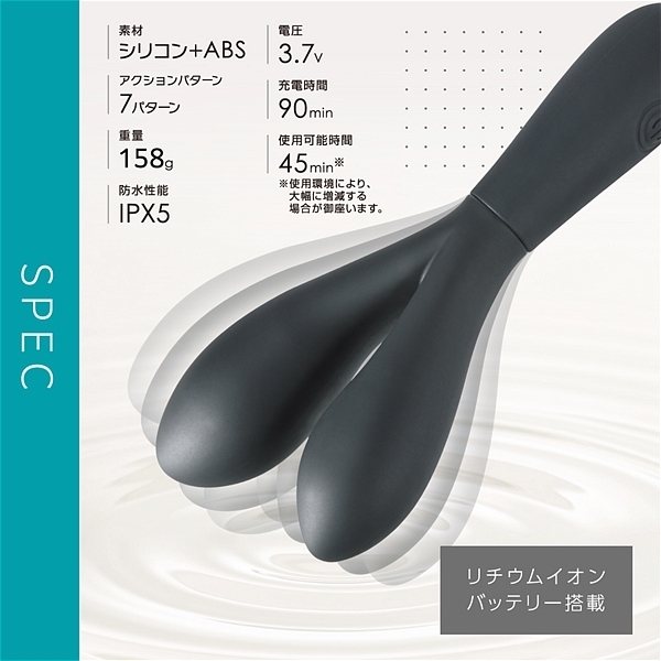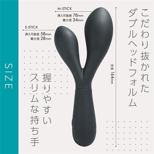 仕様:パッケージ:19.4×10.5×3.6cm 本体:全長16.4cm、大バイブ(挿入部全長7.8cm・最大径3.4cm)、小バイブ(挿入部全長5.8cm・最大径2.8cm) 重量:98g USB充電式