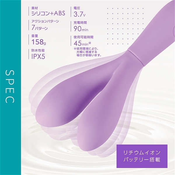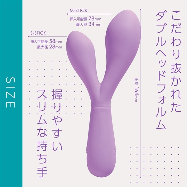 仕様:パッケージ:19.4×10.5×3.6cm 本体:全長16.4cm、大バイブ(挿入部全長7.8cm・最大径3.4cm)、小バイブ(挿入部全長5.8cm・最大径2.8cm) 重量:98g USB充電式