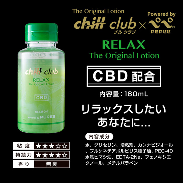 いま話題の成分「CBD」が配合されたやさしい肌触りのローションです。あの大人気ローションブランド「ぺぺ」とコラボした安心安全の日本製ローションです♪こちらのRELAXはスタンダードな使用感のローションで、あらゆる状況に対応可能で使いやすさは抜群!手馴染みの良さにくわえ使いやすい粘度にも注目。少量でも長時間潤う持続力が大変魅力的なローションです♪色は無色透明で味や匂いもありません。本製品はしっかりとした生産管理の元、ヴァージンキャップを採用!人気のCBDを配合した純国産ローションであなたのリラックスタイムを応援します♪※CBDとは大麻草などに含まれる成分のひとつで、そのリラックス感が人気となり、欧米をはじめ世界で話題となっています。精神へ与える作用や中毒性がないことで知られており、医療や健康・美容業界から注目を集める成分です。CBDは、大麻草の成熟した茎および種子から採取された成分で、いわゆる違法大麻と違って、ハイになったり酩酊状態を引き起こす効果はないので、合法になっています。<成分>水、グリセリン、増粘剤、カンナビジオール、プルケネチアボルビリス種子油、PEG-40水添ヒマシ油、EDTA-2Na、フェノキシエタノール、メチルパラベン