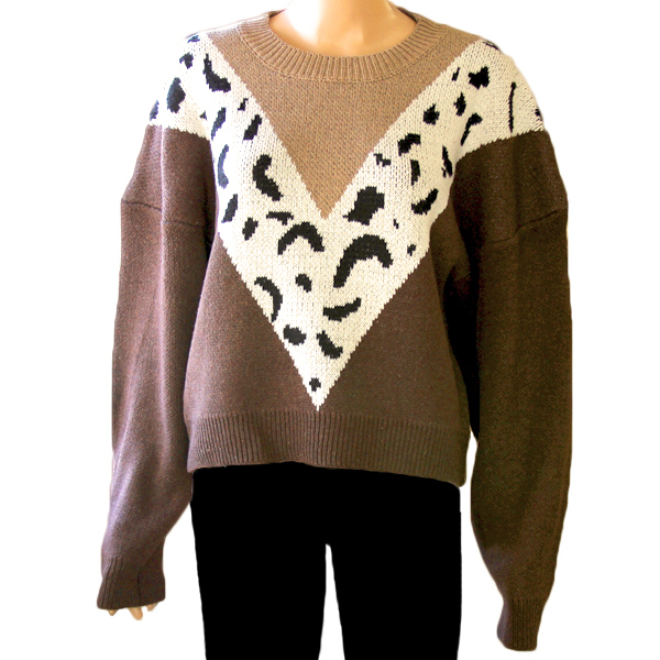 ヒョウ柄模様がV字にデザインされた暖かなニットセーター。ネック部分は緩めに設計され、全体的にもゆったりとした着心地♪厚手なので秋冬の寒い季節も快適に着用できます。デニムやスキニーパンツとも相性抜群です◎※商品写真はできる限り実物の色に近づけるよう加工しておりますが、お客様のお使いのモニター設定、お部屋の照明等により実際の商品と色味が異なる場合がございます。※個人測定の為、サイズに多少のズレがある場合が御座います、糸の縫いがあまかったりほつれがある場合がございますので、理解の上で購入してください。