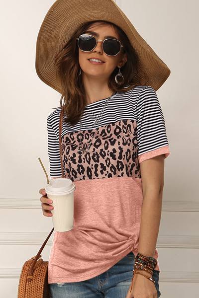 ボーダー×ヒョウ×無地を組み合わせた個性派切り替え半袖Tシャツ。明るいカラーリングで春夏にぴったり!背中側はピンク無地デザイン。Mサイズ◎ピンクカラー※裾は結んであるように縫い付けてあります。※商品写真はできる限り実物の色に近づけるよう加工しておりますが、お客様のお使いのモニター設定、お部屋の照明等により実際の商品と色味が異なる場合がございます。※個人測定の為、サイズに多少のズレがある場合が御座います、糸の縫いがあまかったりほつれがある場合がございますので、理解の上で購入してください。